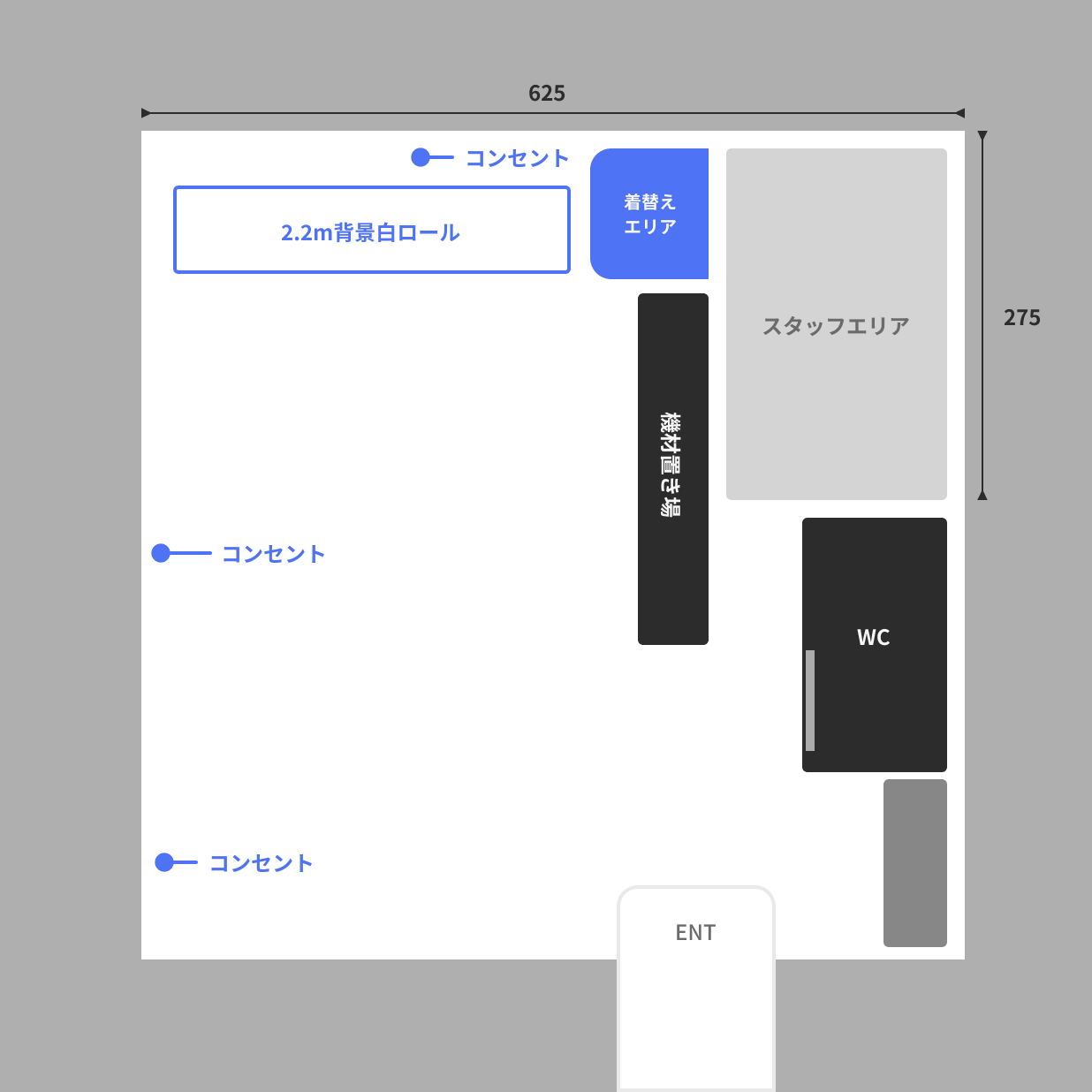 スタジオ内は土足厳禁です。撮影用の靴には必ず養生テープ等で裏貼りの上ご利用ください。